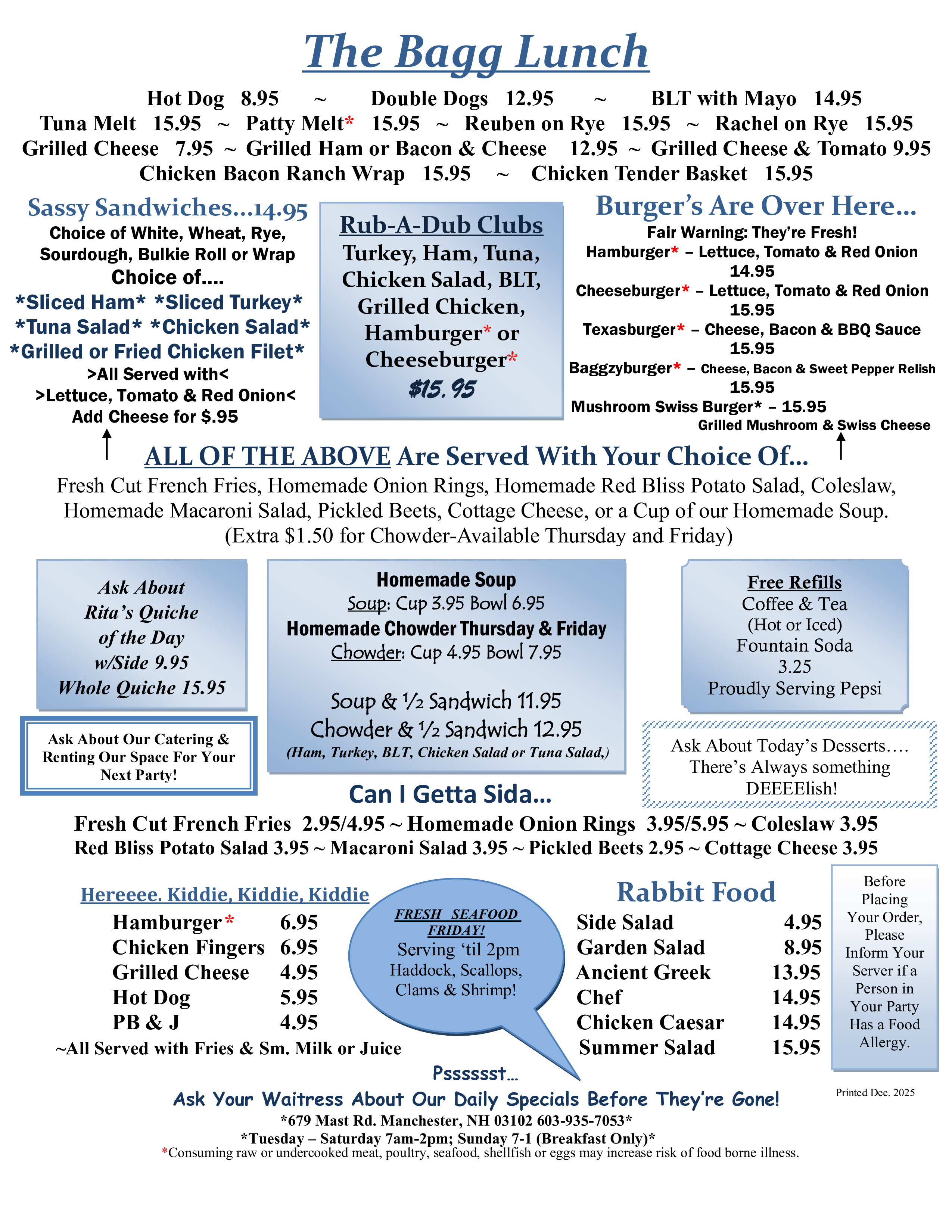 See What Rita Whipped Up Today For Our Homemade Specials...Meatloaf? American Chop Suey? S.O.S? Stuffed Peppers? It changes Daily....Give Us A Call or Check Our Facebook Page To Find Out! 603-935-7053